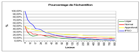 QUALIPSO a développé sa propre courbe d'échantillonnage (courbe bleue sur le schéma ci-joint). Cette courbe est plus exigeante que la courbe d'échantillonnage approfondi pour les petits bâtiments et rejoint la courbe d'échantillonnage léger pour les grands bâtiments.